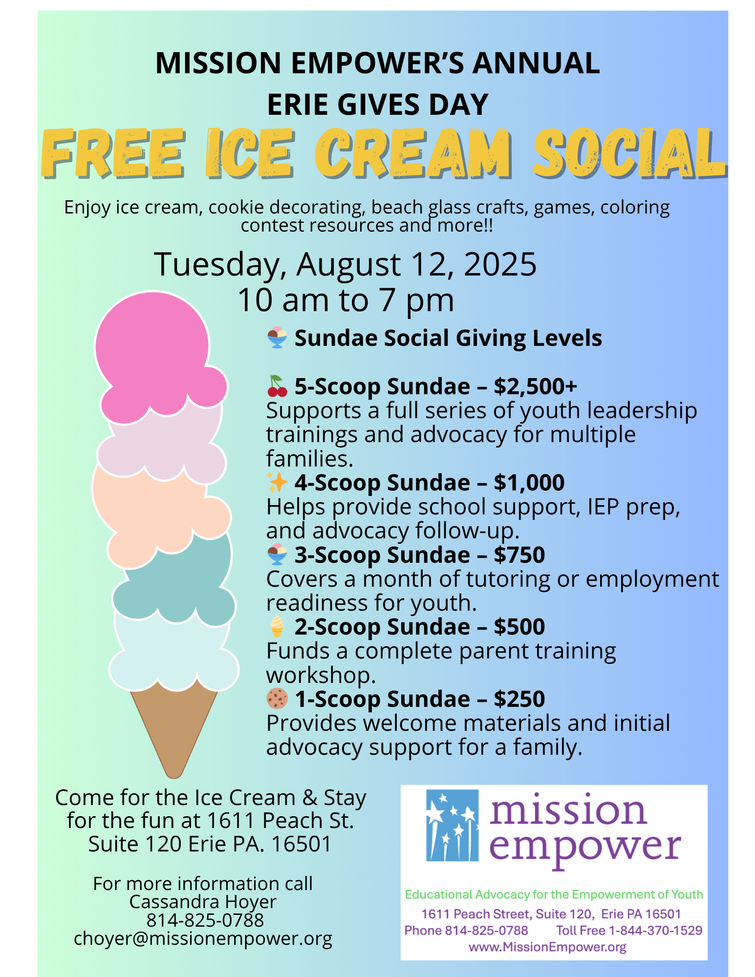 Who doesn’t love free ice cream? Mission Empower will be hosting an ice cream social day. Everyone is welcome! We are asking for donations as well but are not requiring them, so even if you can’t donate you are more than welcome to come join in on the fun and come get some FREE ice cream! BRING YOUR CHILDREN!